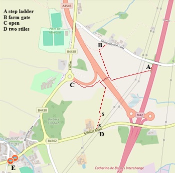 β‘ Head to A via the new path to the bridge, then across wet fields and up a steepish bank to the step ladder and Shadowbrook Lane
